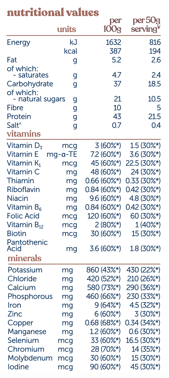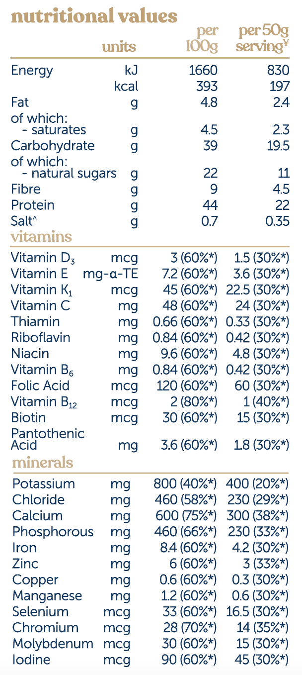 Lactose reduced skimmed milk powder, Whey protein powder (milk), Inulin, Medium chain triglycerides powder (from coconut), Flavour enhancer(erythritol, sweetener (steviol glycosides from stevia)), Spices (3%) (Cinnamon extract, turmeric extract), Natural flavourings, Psyllium husk powder, Vitamins (Sodium ascorbate (Vitamin C), Vitamin E, Niacin, Pantothenic acid, Vitamin B6, Thiamin, Riboflavin, Folic Acid, Vitamin K1, Biotin, Vitamin D3, Vitamin B12), Minerals (Iron pyrophosphate, Zinc sulphate, Manganese sulphate, Copper sulphate, Sodium molybdate, Potassium iodide, Sodium selenite, Chromium chloride)