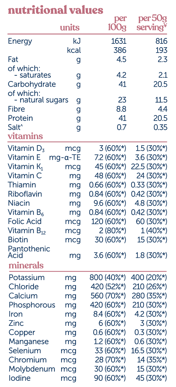 Lactose reduced skimmed milk powder, Whey protein powder (milk), Fruit flakes (7%) (banana, strawberry, acai, lemon), Inulin, Medium chain triglycerides powder (from coconut), Flavour enhancer (erythritol, sweetener (steviol glycosides from stevia)), Natural flavourings, Psyllium husk powder, Red beetroot powder, Vitamins (Sodium ascorbate (Vitamin C), Vitamin E, Niacin, Pantothenic acid, Vitamin B6, Thiamin, Riboflavin, Folic Acid, Vitamin K1, Biotin, Vitamin D3, Vitamin B12), Minerals (Iron pyrophosphate, Zinc sulphate, Manganese sulphate, Copper sulphate, Sodium molybdate, Potassium iodide, Sodium selenite, Chromium chloride)